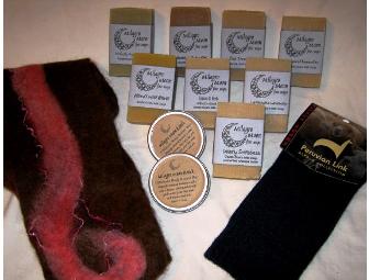 Enjoy several of our ranch specialities in this collection. Treat yourself or someone you care about to eight assorted bars of all-natural, hand-crafted goat's milk soaps; two luscious Body Butter Bars for treating dry skin; one pair of imported alpaca socks; and a hand-felted alpaca scarf. All items except the socks are hand-crafted here at our farm.