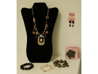 Multicharm Waterfall Necklace with Filigree Flowers, Baroque Hearts and a Leopard Print Pendant with Crystals and Cameo Center.