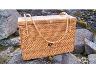 This handbag is woven of auburn reeds with black reed detailing.  It has a clasp and matching top.