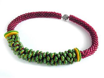 This breathtaking crotched necklace features ruby red Miyuki seed beads and multi colored Indonesian lamp beads with a sterling silver clasp. Eileen Glenn's passion is jewelry and she works in beads and metal. She will be at the Evanston Farmer's Market this summer.