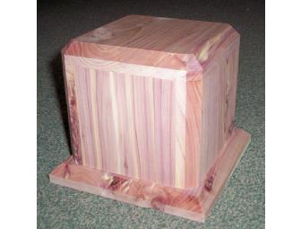 This pet cremation urn is made from unfinished aromatic red cedar. It will hold the cremains of any pet with a live weight up to 50 lbs. Exterior dimensions are 6.5" wide x 6.5" deep x 5.5" high.