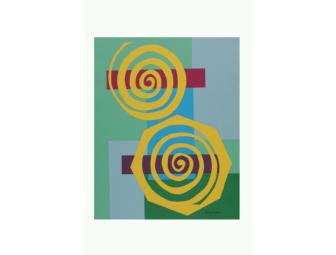 Initially she pursued screen-printing by adapting environmentally compatible inks for work at home. Creating multilayered designs and watching each printed color emerge to form an image was utterly delightful for her. Recently Jane switched her primary medium to paper cut outs, a process far more fluid and flexible than screen printing. She enjoys cutting and arranging pieces of colored paper to form interesting images!