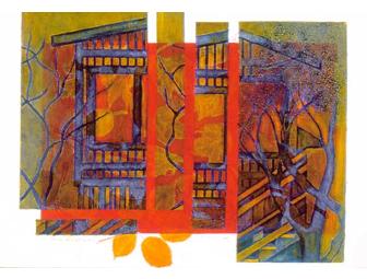 When creating a mixed media print, she blends and layers colors and imagery. She reflects back and puts on paper her response to a place or event. The imagery here reflects joy and passion for nature, community and home.