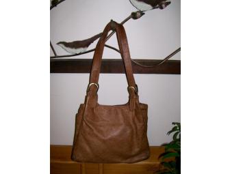 This Great American Leatherworks shoulder bag in brown leather is stamped with floral design. There are three main compartments - two with magnetic snap closures and the other a zippered closure. Inside there are slip pockets and a zippered cosmetic pocket. Outside is another zippered pocket. In excellent condition, the only sign that the bag may have been used is a darkening in the color of the leather on the base and some darker spots on one of the handles - or it may just be a natural variation in the leather.
