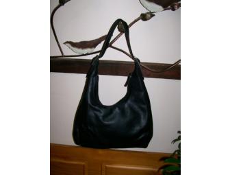 This cute little bag has no designer name and is made from simulated leather. That doesn't take away from the smart style. The purse is one main compartment with a zippered side pocket inside. Accessorized with silvertone buckles.