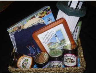 A Nantucket-Style Woven Storage Basket, a Lighthouse Bird Feeder, Four Types of Massachusetts-made Jars of Jams, Jellies, and Conserves, one box of Salt Water Taffy, Five Hand-woven Nantucket dishtowels w/nautical design, and One Wooden Picture Frame w/Lighthouse Picture Insert. Signature message taped to glass of frame says..."Greetings from Cape Cod, Massachusetts!" and "Bateman / Canton logo on glass.