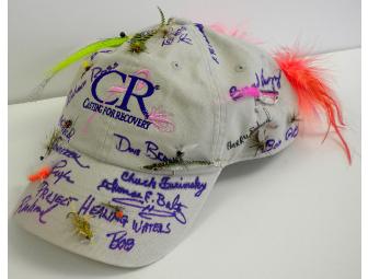 Celebrity Fly Tiers Hat #1 features wonderful hand-tied flies and autographs specifically for Casting for Recovery fundraising purposes by top names (and CFR fans) including Tom Baltz, Bob Clouser, Brad Buzzi, Greg Heffner, Bob Mead, Marc Petitjean, Dave Schmezer, Richard Ross, Bill Newcomb, Enrico Puglisi, Harry Schoel, and Dave Brandt. The Lady Bug fly on this hat alone is valued at $100. Collected during the Fly Fishing Show in Somerset, NJ, in 2010.