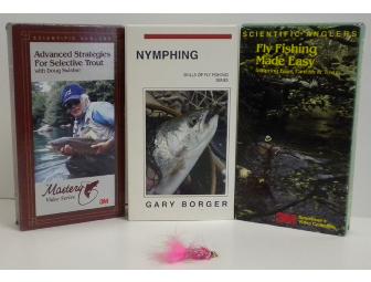 “Advanced Strategies for Selective Trout” by Doug Swisher, “Nymphing” by Gary Borger, “Flyfishing Made Easy featuring Bass, Panfish & Trout.”