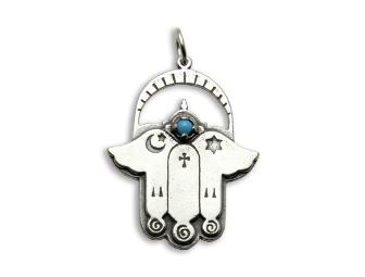 The Hand or "Hamsa" was inspired by the three religions of Judaism, Islam, and Christianity in the Middle East. This symbol features a Star of David balancing the symbol of Islam, a crescent moon and star, and a Cross. The wearer of this amulet becomes a messenger of love and planetary healing. A percentage from the sales of this hand is donated to Peace efforts in Israel and Palestine.