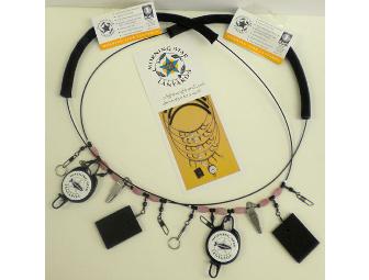 Handsome, lightweight and very cool alternative to wearing a vest! Hand-crafted pink beads, quick-release safety breakaway, retractor, fly patch, and tippet holder included, stainless steel clip, quality swivels, comfortable and supportive nylon neck band, black, vinyl-coated stainless steel cable for corrosion resistance.