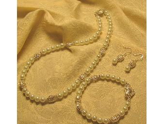 Influenced by Miss Scarlet, the set includes a 20" necklace and 8" bracelet, with Faux pearls and sliver plated accents beads, both with a silver plated magnetic heart shaped clasp. The final touch is a delicate pair of sterling silver wire earrings that completes the collection.