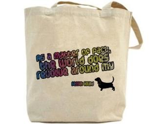 As a Matter of Fact the World does Revolve Around by BASSET HOUND tote bag in natural color with rainbow colors with the words As a Matter of Fact the World does Revolve Around by BASSET HOUND on both sides. 16 x 16