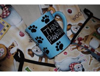 Cute "doggie" kitchen towels, mitts by Kay Dee designs for your kitchen along with a nice big mug with bark Less Wage More on one side and Think Pawsitive on the other.