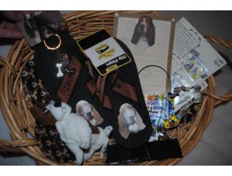 Basset Hound theme items in this basket include Flip Flops (size Women s 5-6), Magnetic Ears Stuff dog, Key chain, Note Pad, Stamps, Magnets, House is NOT a Home without a Basset Hound.