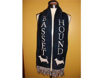 Soft and beautiful chenille basset hound scarf. The scarf is a black color with cream colored writing and bassets.