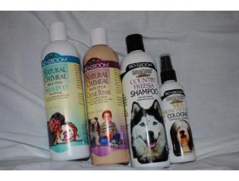 Bio-Groom package includes Natural Oatmeal Anti-Itch Shampoo Soothing and Creame Rinse Concentrate; Country Freesia shampoo with skin soothing chamomile and aloe vera and Wild Honeysuckle cologne.