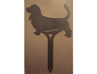 Add a statement to your home or garden with this black metal basset stake. Powder coated to be outside. Each comes with a rod to poke in the ground or you can attach them to a fence/building or hang on a tree. Measures: 15" high x 11" wide