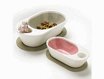 Two-tone pill-shaped bone china/porcelain dog bowl. In the case of the Zen bowls, form really does follow function. Our design team has spent countless hours observing pet dining habits and studying the anatomical differences between the species and individual breeds. Our latest innovation is the uniquely shaped Zen dish, which conforms ergonomically to a dog`s mouth and can also provide relief to cats with hyper-sensitive whiskers. Additional features include a thumb hole for easy gripping. Oh. . . by the way, it doubles as a treat receptacle for `two-course` dining. Size: 8.25 inches (W), 12 inches (L), 5 inches (H)