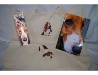 Flat Basset Package: Tote Bag (18" x 18") with embroidered Basset Hound, Basset Hound Bookmark, Arfur T. Leadbottom Sings by Beth Howering and Flat Basset figurine.