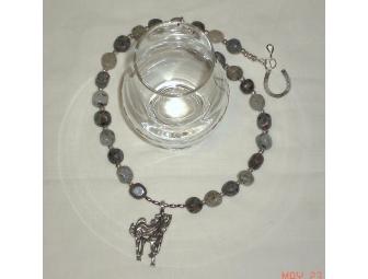 Darby Ladd: Named for a wonderful retired racer, this handmade necklace is as exciting and fun as he was. Beautiful gray jasper is combined with silver plated glass beads in several shapes. A lovely pewter pendant of a horse finishes it off, along with a horseshoe charm. A silver plated hook and eye clasp holds it all together. Finished length is about 22 inches, not counting the pendant. The pendant measures about 1 x 1-3/4". A delightful necklace for lovers of fine jewelry and horses!