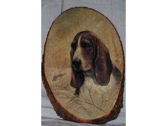 Vintage Basset Hound with rabbit on wood from the Garden of the Gods in Colorado.