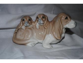 Dalia Handcrafted Fine Porcelain Basset Figurine from Mexico. Features Momma Basset and two Basset puppies. 5" L x 3"H x 1.5 W
