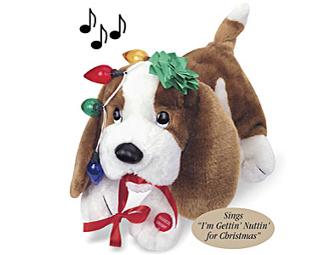 Trouble' the musical dog is true to his name! Looks like this plush pup's tangled up in holiday lights, and there's even a bow in his mouth! Press his paw and lights flash, his tail wags, head sways and mouth moves to the tune, "I'm Getting' Nuttin' for Christmas." Batteries included. 14" long.