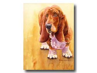 This is a watercolor of a Basset Hound by Michael Steddum. This "Basset Hound" print is no longer in circulation so this is a rare find. The print comes framed and ready to hang.