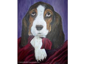 Original painting by Deborah Burdin, 11"x14" Acrylic on Canvas, Comes backed and strung with wire and Certificate of Authenticity included. "Love Me Please" is rescue art specifically created to benefit AZBHR. The painting was finished in February 2010 to celebrate Valentine's Day acknowledging the loving bond we have of our canine best friends. This painting was based on model Maybelline, a very special AZBHR dog born to Phoebe one of the 50 plus Bassets taken in by AZBHR from a mill in Arizona.