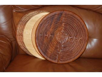A hand engraved Teak finger labyrinth. App. 32cm or 12.5" in diameter. It is created using a slow prayerful approach allowing the essence of the wood to speak as it is unfolding. Once the engraving is finished there are up to 8 levels of sanding and oiling to bring out the beauty of the wood.