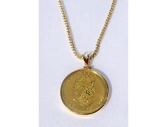 Designed by Jewels by Joseph of Newport Beach and generously donated by S. Paul and Marybelle Musco, the centerpiece of this exceptional necklace is the 2007 Canadian Gold Maple Leaf, the official gold buillion coin of Canada. The one troy ounce denomination is .9999 fine gold (24 carat). The centerpiece is on a fine gold necklace with elegant design work.