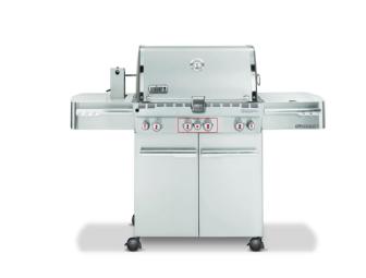 Beautifully encased in sleek, professional-grade stainless steel, this Weber gas grill has Weber's Sear Station which can be turned on to reach temperatures of up to 900 degrees for restaurant quality searing; four stainless steel burners; a flush-mounted side burner; a dedicated smoker burner; a Grill-Out Handle Light for cooking in low-light conditions; and an infrared rear-mounted rotisserie burner.