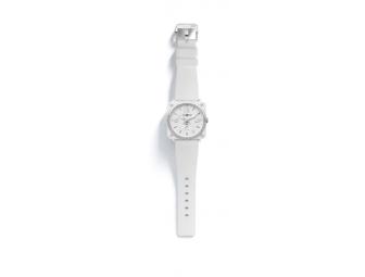 This elegant timepiece features quartz movement, a white ceramic case in brushed stainless steel, and hands coated in a highly luminescent pigment to make them easier to read at night. The watch is water resistant up to 50m and has a genuine leather strap.