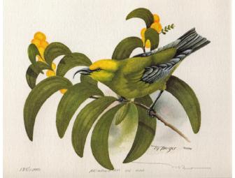 Marian Berger is a well known local artist who has been painting endangered Hawaiian birds for over 30 years. Her watercolors are sought after by some of the most discriminating collectors. We are honored to present a pair of her birds as signed, limited edition giclees: Akiapola`au in a Koa tree (135/1000) and O`o in an Ohia tree (1/200). These prints are matted with a beveled, ivory matting. Measures approximately 14 x 11 inches.