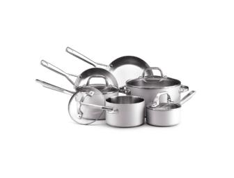 This set features heavy duty, professional-style cookware with a think exterior of fast and even-heating brushed aluminum bonded to a cooking surface layer of gleaming, non-reactive stainless steel. This package includes: a 1-quart covered saucepan, a 2-quart covered saucepan, a 3-quart covered saucepan, a 6-quart covered stockpot, an 8-inch open skillet, and a 10-inch open skillet.