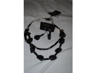 Handmade jewelry by Kelly one of AZBHR's volunteers. Matching set of earings and necklace (18 inch chain) featuring black, purple, blue and silver colors.