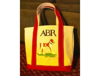Beautiful doesn't begin to describe this hand painted tote.  Sporting a handsome orange and white Brittany and the ABR letters - this will be sure to garner lots of compliments.