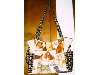 "Ears to You" handmade shoulder bag measures 14" wide x 10 ½" high x 4 ½" deep Adjustable fabric ties above 2 outer side pockets, 5 interior pockets, magnetic snap closure