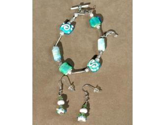 Misty and magical this elegant artisan bracelet features aqua over ivory with freshwater pearls, Bali silver and the Man in the Moon. Matching earrings are included with this charming jewelry set. The essence of Deb Rich's artistic expression is revealed in each lampwork bead that she creates in her studio. Deb's beads exhibit her desire to create and inspire change through community outreach. These jewelry pieces are offered exclusively through cMarket to support the fundraising efforts of non-profit organizations. Lampwork glass reflects both the heartfelt passion and interpretative expression of Deb Rich. Her artistic resume includes fantasy sculptures, creatively fashioned from found-objects and recycled materials. Deb's Glass Designs are truly hypnotic, one-of-a-kind pieces that cannot be replicated or manufactured by a machine. Deb only sells jewelry pieces that capture the grace and flow of glass artistry. All jewelry is made with sterling silver or copper findings, Czech or Swarovski Crystals, and various complementary beads, making Deb's Glass Designs positively the best choice.