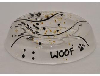The pet bowls are hand-cut glass, designed and created by Dana then kiln-fired twice. Size 7.5" wide, 1.75" tall and holds 5oz of food or water. The 1/8" glass bowls are very durable as they are tempered during the fusing process. Dishwasher safe but may etch with hard water or harsh detergents. An added bonus is that because of the bowl design, your pet can not pick it up and drag it around the house! Plus the glass will not retain bacteria like a plastic bowl can.
