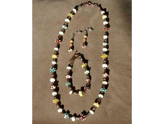 Earthy colors mixed with copper spacers and clear rondelles create a casual yet sophisticated 22 inch necklace. Matching 7.5 inch bracelet & earrings are included creating an artistic jewlery trio. The essence of Deb Rich's artistic expression is revealed in each lampwork bead that she creates in her studio. Deb's beads exhibit her desire to create and inspire change through community outreach. These jewelry pieces are offered exclusively through cMarket to support the fundraising efforts of non-profit organizations. Lampwork glass reflects both the heartfelt passion and interpretative expression of Deb Rich. Her artistic resume includes fantasy sculptures, creatively fashioned from found-objects and recycled materials. Deb's Glass Designs are truly hypnotic, one-of-a-kind pieces that cannot be replicated or manufactured by a machine. Deb only sells jewelry pieces that capture the grace and flow of glass artistry. All jewelry is made with sterling silver or copper findings, Czech or Swarovski Crystals, and various complementary beads, making Deb's Glass Designs positively the best choice.