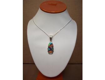Sterling silver 20'' chain with Zuni handcrafted inlay pendant. The pendant contains opal, black onyx, turquoise, spiny oyster, charoite, and gaspeite.