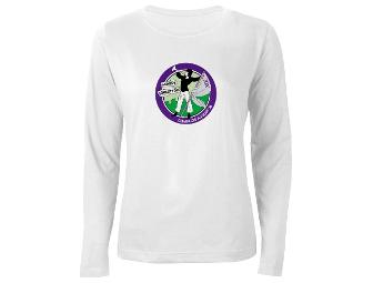 Longsleeve tee-shirt with the "New Bugler Girl" imagery created by Jan Lisa Huttner & Melissa Wilks of WomenArts in honor of the 90th anniversary of the adoption of the 19th amendment. (Modeled on original image created by Caroline Watts in 1908 who designeg the ASL/NUWSS “Bugler Girl” for the procession of 13 June 1908.)