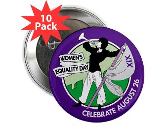 10 2.25" buttons with the "New Bugler Girl" imagery created by Jan Lisa Huttner & Melissa Wilks of WomenArts in honor of the 90th anniversary of the adoption of the 19th amendment.