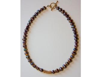 This elegant 18 inch necklace of pearls and vermeil is personally handcrafted by artist, Hali Karr. Hali is known for creating jewelry of semi-precious stones, pearls, new and vintage beads and mixed metals. She strives to create a balance between art and fashion. Her jewelry is available at an annual fall trunk sale and year-round by appointment.