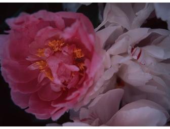 This beautiful double flowered Candy Striped Peony unfolding and revealing its inner self is a wonderful addition to any decor. An archival Giclee print, it measures 23" X 17.5" and was mounted, matted, and framed professionally by Harold at The Paint Bucket.