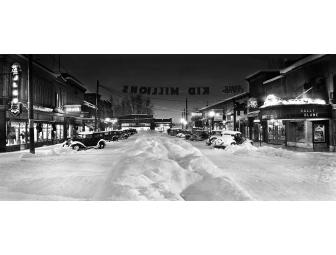 This framed black and white photograph depicting First Avenue in downtown Sandpoint, Idaho in 1934 is one of Ross Hall's most well-known works. It measures 18" X 26".