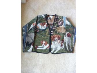 Up for bid is this beautiful tapestry jacket with multiple pictures of Brittany's on it. It is a size XS but it is a very large XS. (I put it on and wear a size 12 - I could get it closed but it was too tight so I believe a size 10 could easily wear it if they didn't try to close it).