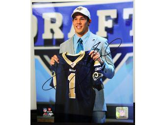 Move over Oklahoma, he's ours now! No sports collection is complete without an autographed photo of Sam Bradford holding his new St. Louis Rams jersey. Drafted first overall this year, Bradford broke passing records in college for a half (363 yards) and broke the NCAA freshman record for touchdowns (30). He also won the Heisman trophy as a sophomore in 2008. The 8 x 10 autographed photo of the new Rams quarterback would be a perfect addition to a den, family room, living room, bedroom, kitchen...anywhere you want to cheer on the Rams.