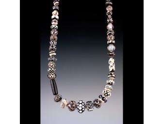 Black and white optic necklace; flameworked soda lime glass beads and sterling silver accent beads and clasp. 24" long